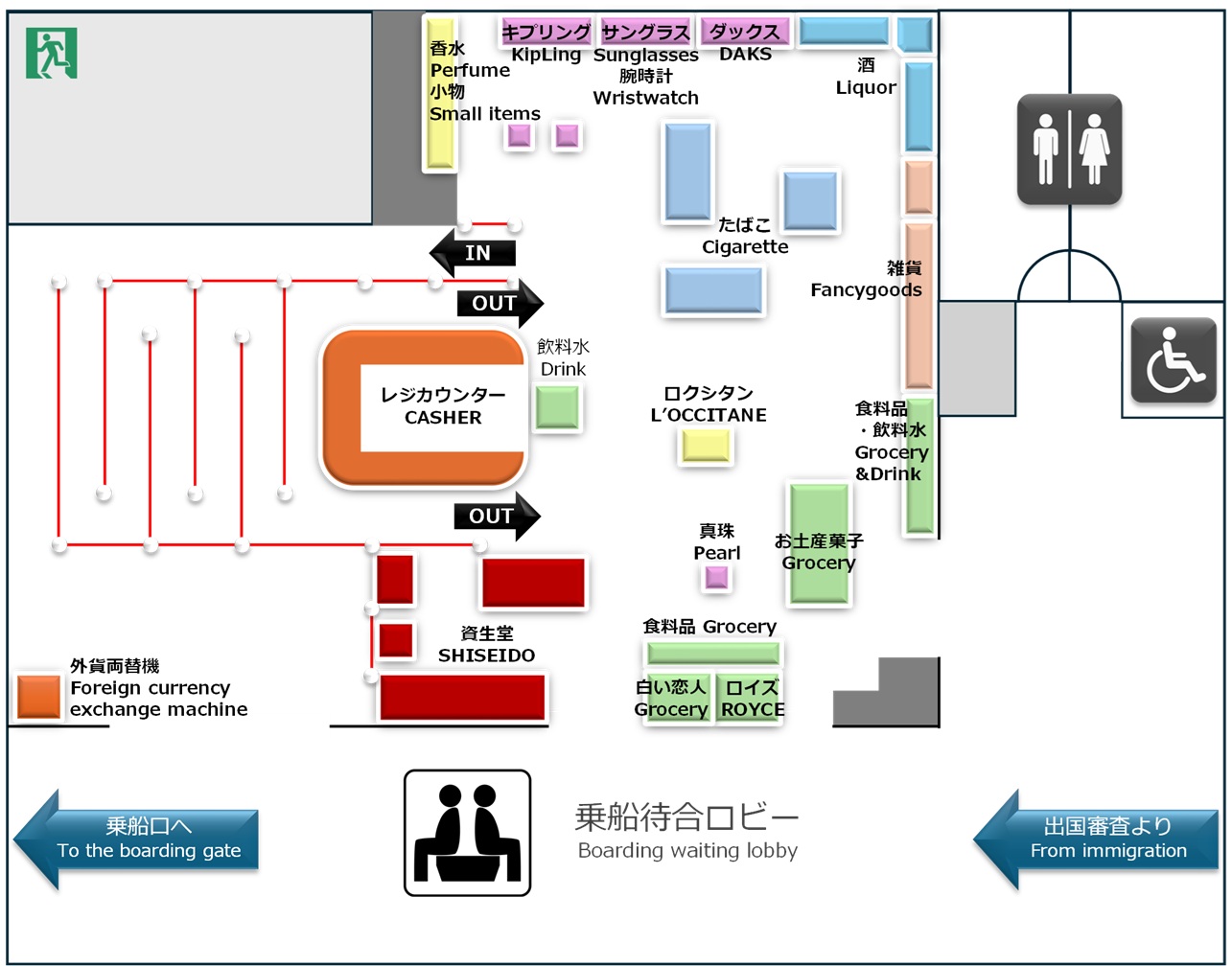 出国審査がお済になられたら、船舶の出航時間まで免税店でごゆっくりとショッピングをお楽しみください。